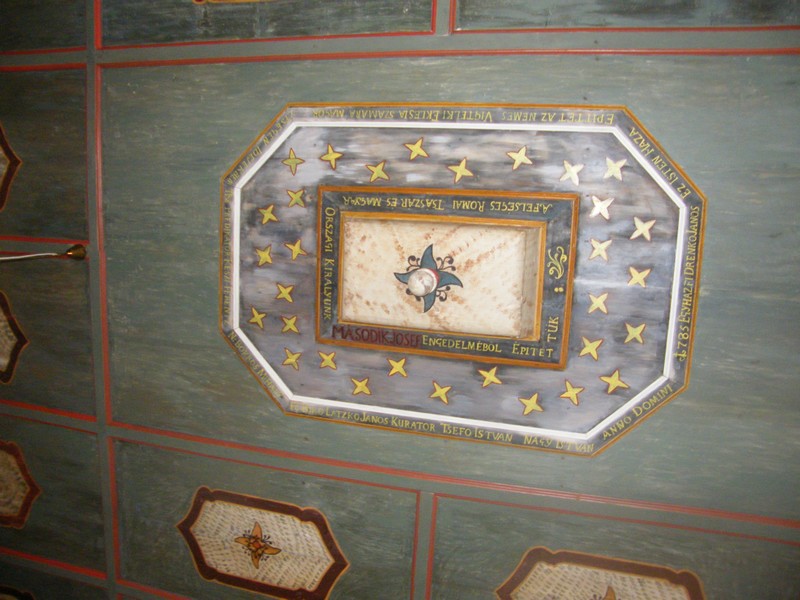 b) A mennyezet közepén: „Építetett 1785 idejekben Tsefo András, Kovács András, Bene Mihály, Bene János A Felséges róm. csász. és magyarországi Vezérünk Második József engedelméből építettük”.