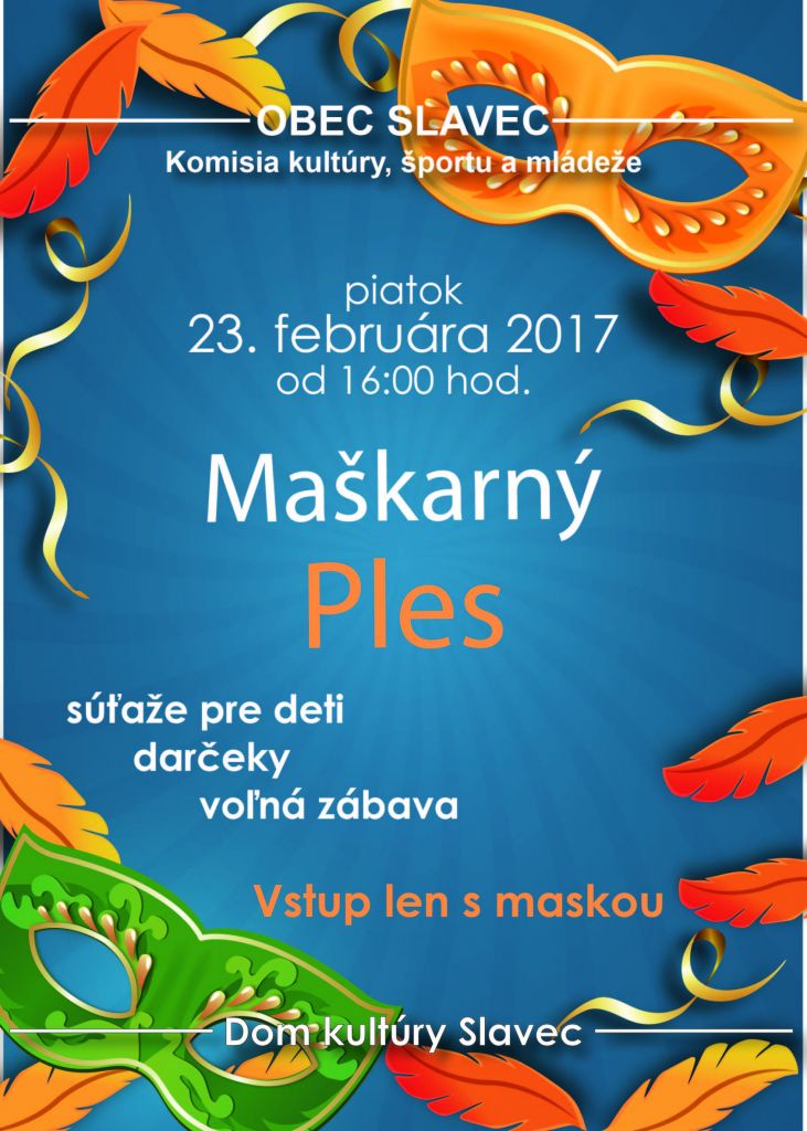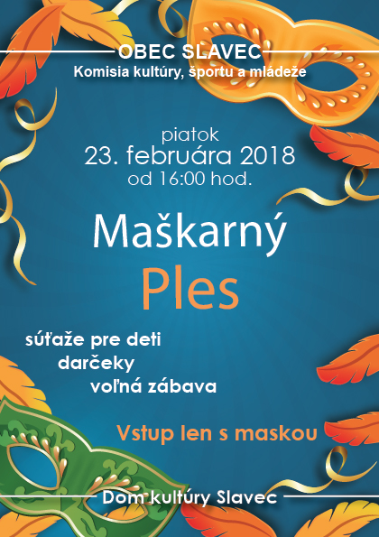 Komisia kultúry,športu a mládeže pri obecnom zastupiteľstve obce Slavec srdečne pozýva deti na maškarný ples, ktorý sa organizuje dňa 23.02.2018 v kultúrnom dome v Slavci so začiatkom o 16:00 hod.