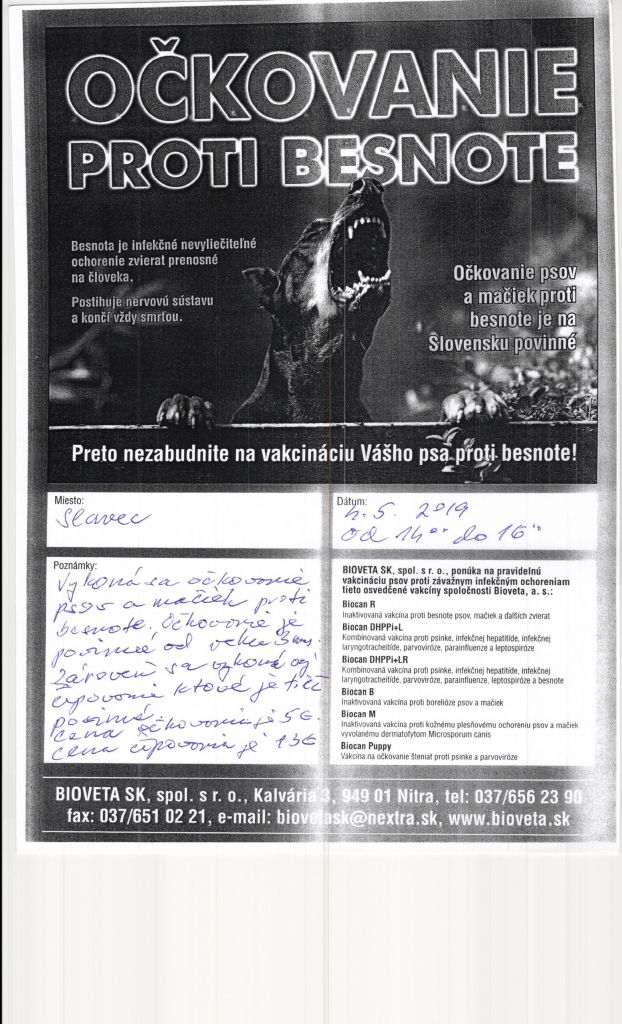 Oznámenie- očkovanie psov a mačiek 4.5.2019