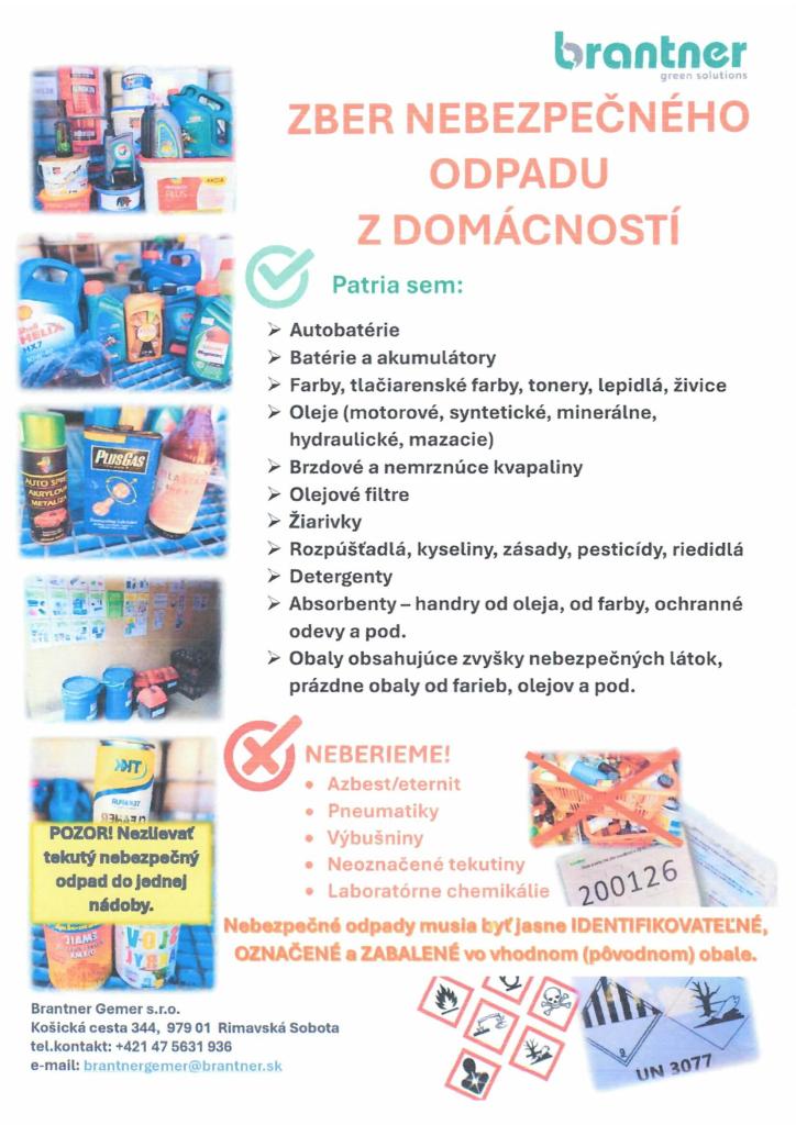 Brantner Gemer s.r.o. organizuje dňa 4.3.2025 zber nebezpečného odpadu v obci Slavec- Vidová. Zbierajú sa rôzne nebezpečné materiály, ako sú autobatérie, farby, oleje a iné. Odpady musia byť jasne označené a zabalené vo vhodných obaloch. Nepatria sem pneumatiky, azbest a laboratórne chemikálie. Kontaktovať ich môžete na uvedenom telefónnom čísle alebo e-mailom.